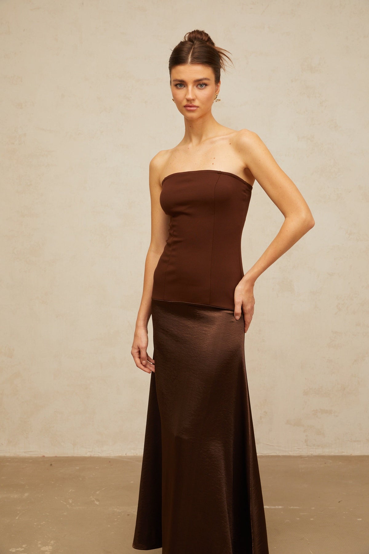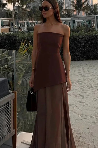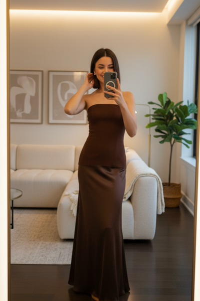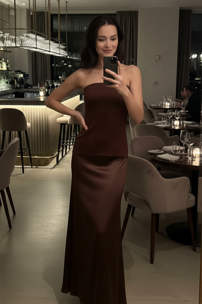 Straplez Kahverengi Saten Maksi Elbise