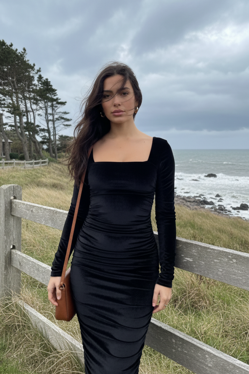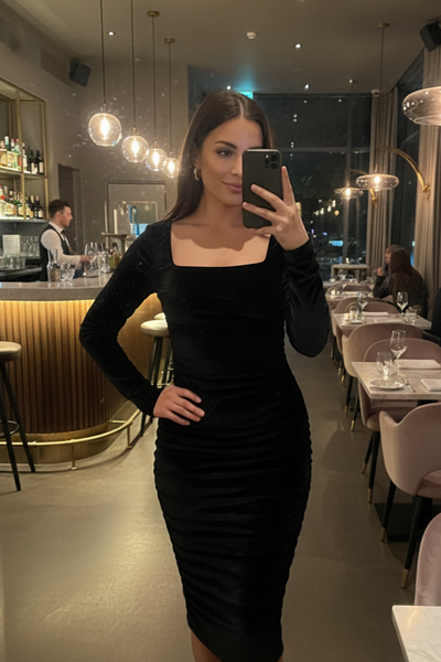Siyah Kadife Midi Elbise
