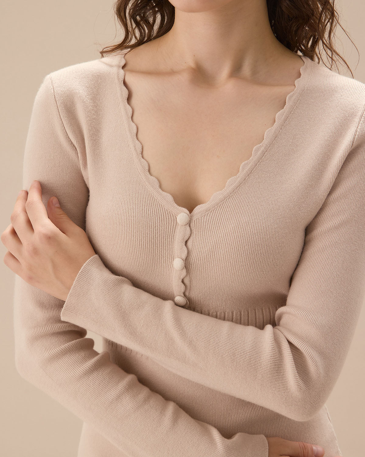 Bej Rengi V Yaka Vücuda Oturan Kazak Elbise